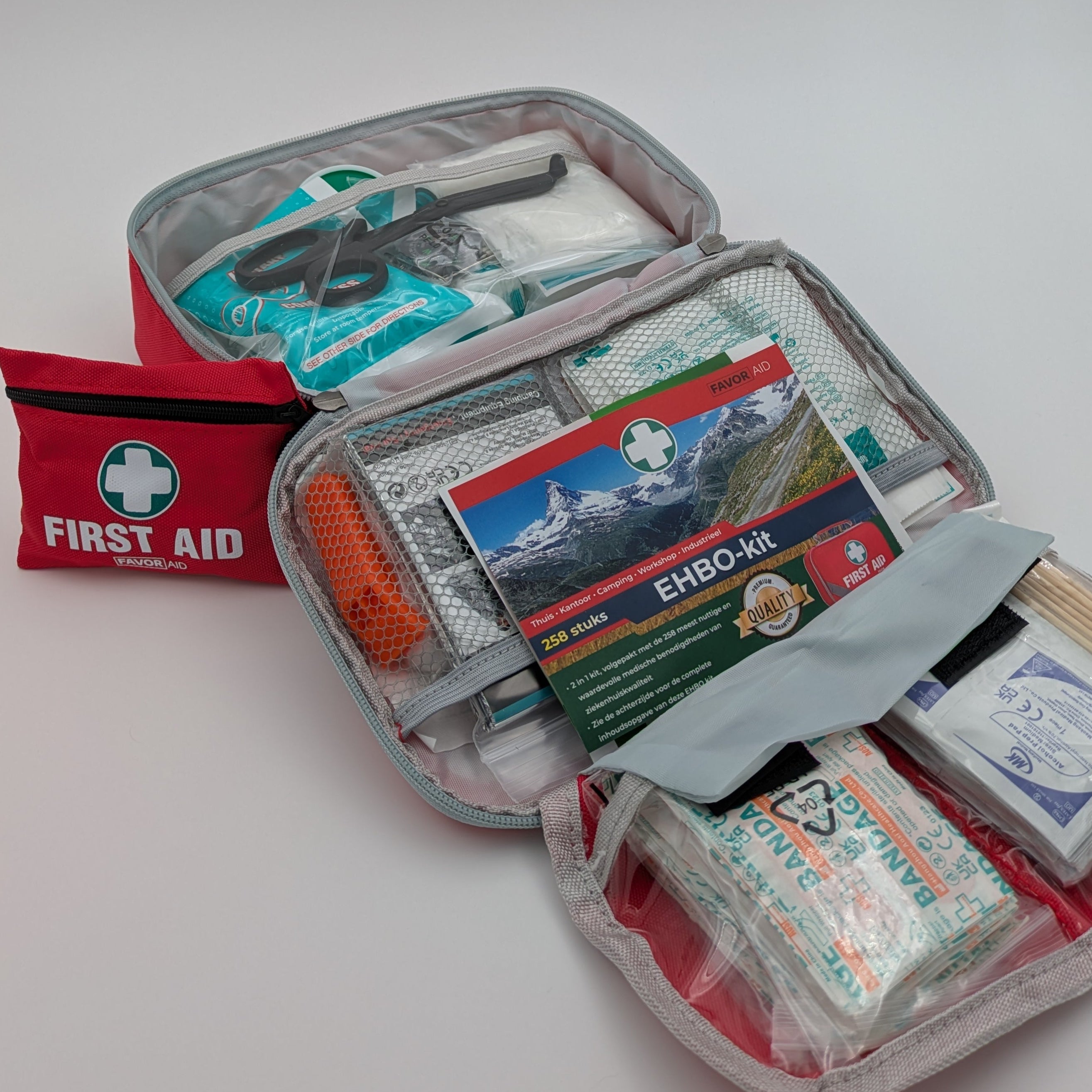 De FavorAid Complete is onze 258-delige EHBO-kit die je voorziet van alle benodigdheden voor eerste hulp, zowel thuis als onderweg. Deze kit bevat een uitgebreide selectie van items, zoals verbandmiddelen, wondverzorging, icepacks en een kompas, zodat je goed voorbereid bent in verschillende situaties.